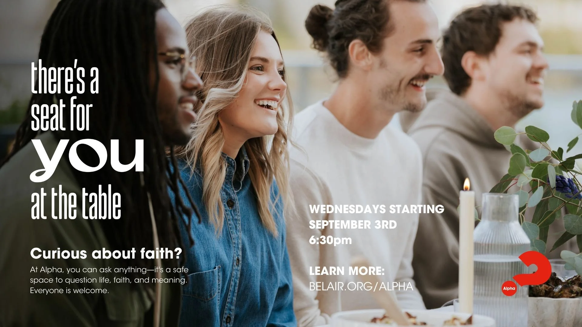 Alpha is a place to explore life’s big questions in a relaxed, no-pressure environment. Each week includes dinner, a short video, and open conversation about faith, meaning, and purpose. Whether you're new to faith, curious, or just looking for a place to talk, Alpha is for you.