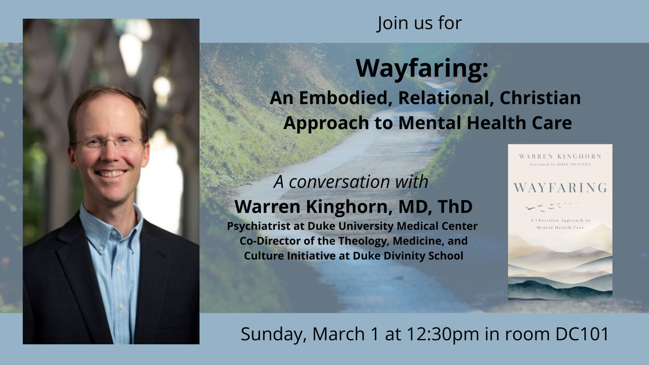 We are honored to welcome Warren Kinghorn, MD, ThD on Sunday March 1 at 12:30 in DC101 for a special event exploring Theology and Mental Health. Dr. Kinghorn serves as co-director of the Theology, Medicine and Culture Initiative at Duke Divinity School and holds a unique dual appointment at Duke University School of Medicine as Professor of Psychiatry and at Duke Divinity School as Professor of Theology.