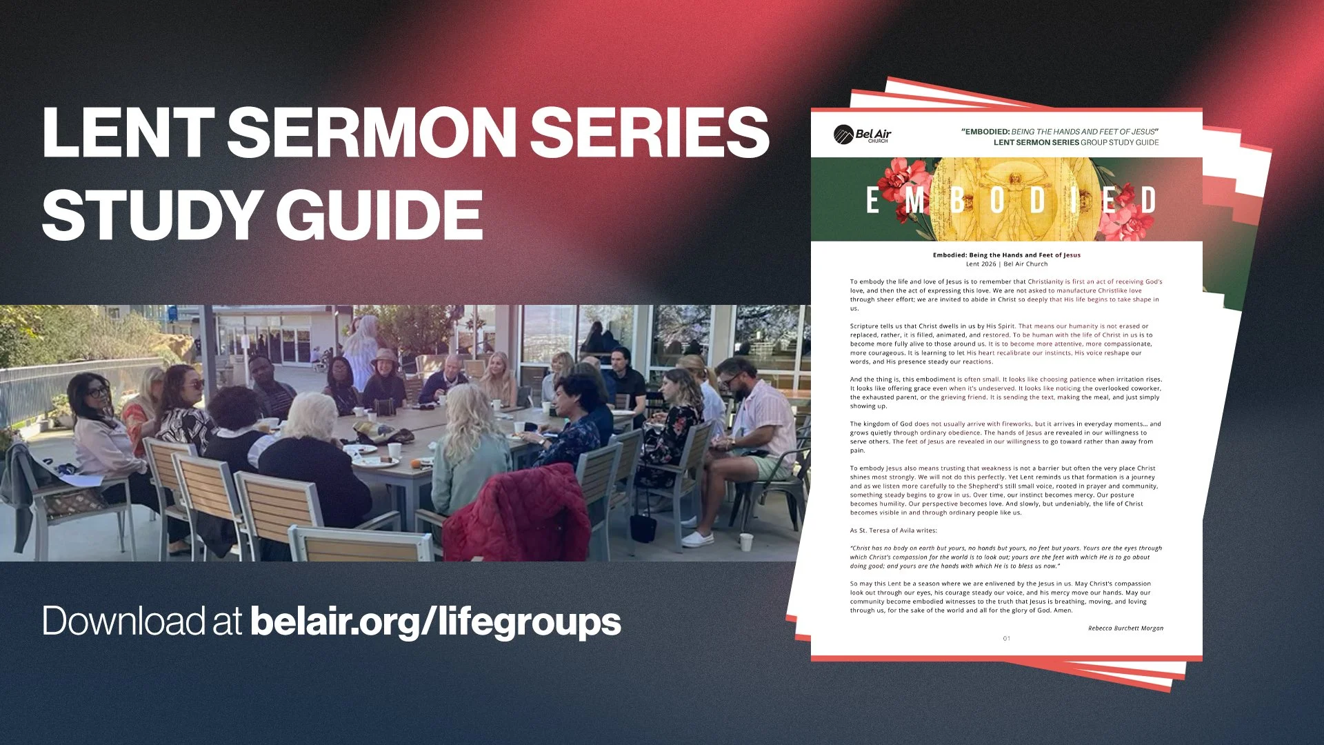 This Lent, we invite every Life Group at Bel Air Church to journey together through Embodied: Being the Hands and Feet of Jesus. This study guide is designed to help us remember that following Jesus begins with receiving His love and then allowing that love to take shape in our everyday lives. As we gather in homes, on campus, and online, this resource will lead us into Scripture, prayer, and honest conversation about what it means to let Christ dwell in us by His Spirit. Together we will explore how small acts of patience, courage, mercy, and presence become the very ways Jesus makes Himself visible in Los Angeles and beyond. Lent is not about striving harder, but about abiding deeper. As a community rooted in Christ and committed to being the Church at Work, may our Life Groups become spaces where His compassion recalibrates our instincts, steadies our voices, and moves our hands toward those in need.