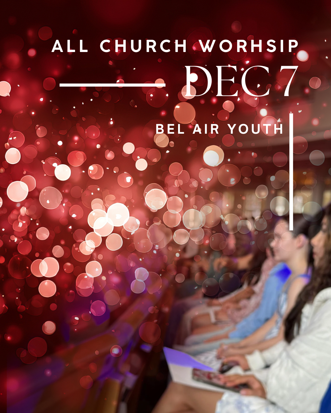 Bel Air Youth will be meeting in the sanctuary for worship December 7th at 11am. Then everyone will go to the student center for a lesson and discussion groups.
